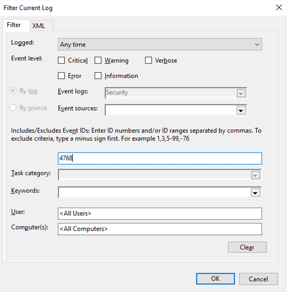 | 4768 | Kerberos-verificatieservice | Geslaagd en mislukt | Er is een Kerberos-verificatieticket (TGT) aangevraagd |