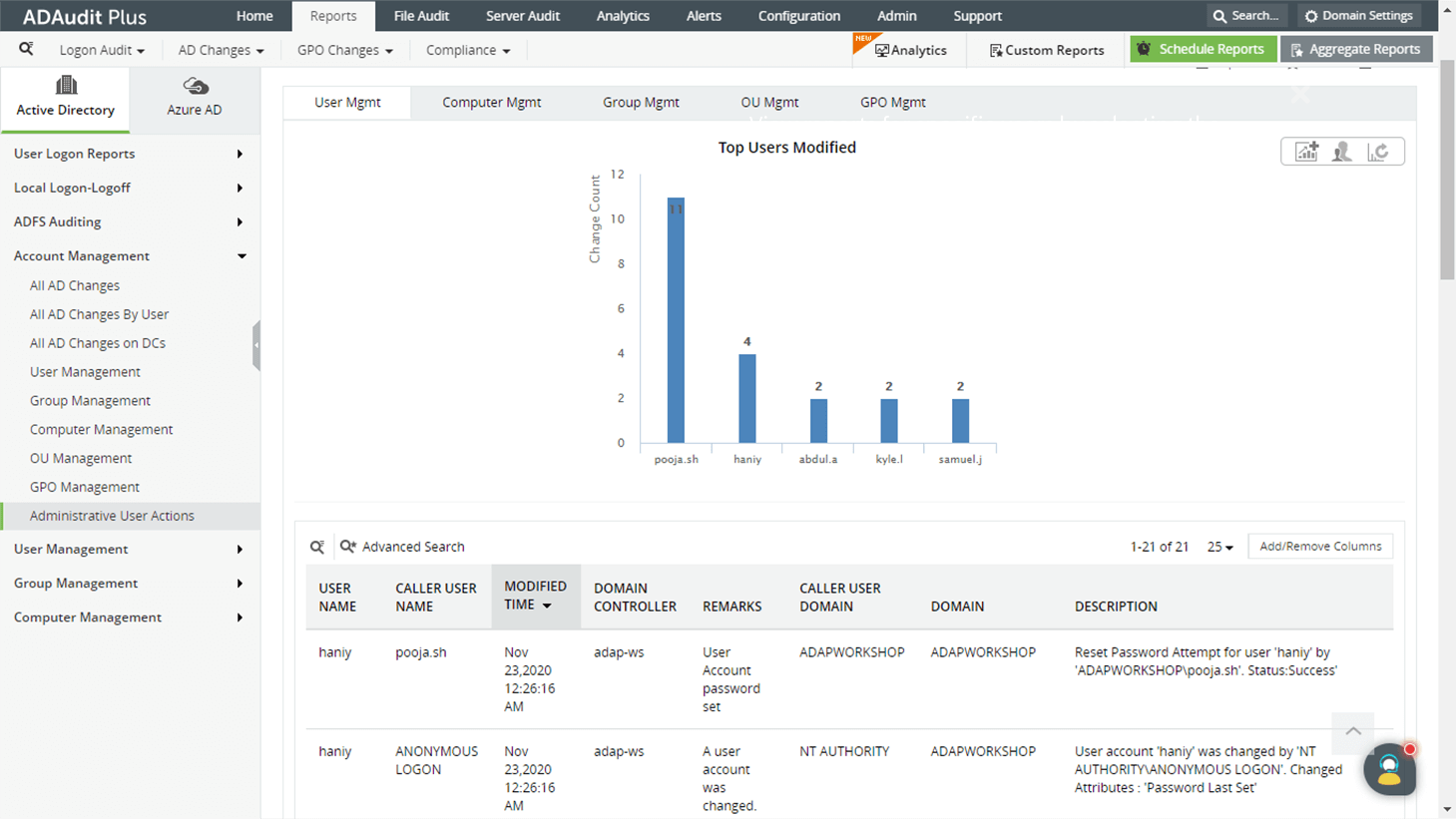 ADAudit Plus, een uitgebreid AD-controle hulpprogramma, helpt u bij het controleren van alle wijzigingen in uw Active Directory, inclusief de wijzigingen die worden uitgevoerd door beheerdersaccounts.