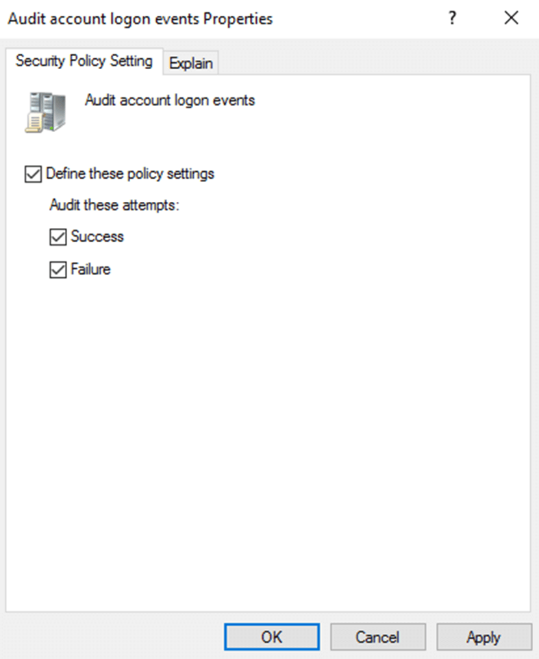 - Dubbelklik in het rechterdeelvenster opAanmeldingsgebeurtenissen voor audit accounts en vink de vakjes naast Definieer deze beleidsinstellingen, Geslaagd en Mislukt aan.