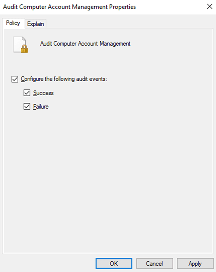 - Navigeer naar Computerconfiguratie > Beleid > Windows instellingen > Beveiligingsinstellingen > Geavanceerde configuratie van controlebeleid > Controlebeleid > Accountbeheer > Computeraccountbeheer controleren en vink de vakjes naast Configureer de volgende controlegebeurtenissen, Geslaagden Mislukt aan.