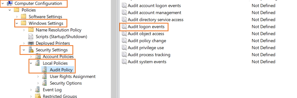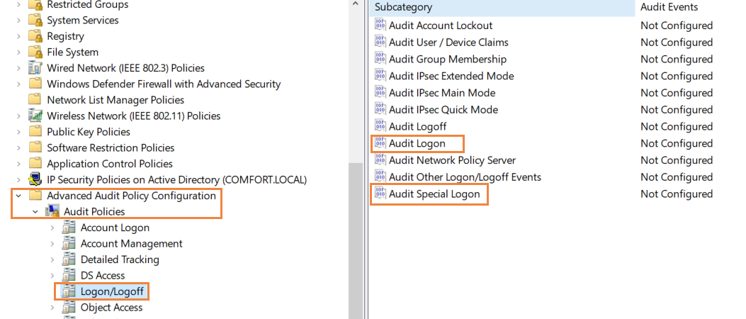 - Ga terug naar Computerconfiguratie en navigeer naar Windows instellingen> Beveiligingsinstellingen> Geavanceerde configuratie van Controlebeleid> Controlebeleid> Aanmelden/afmelden.
