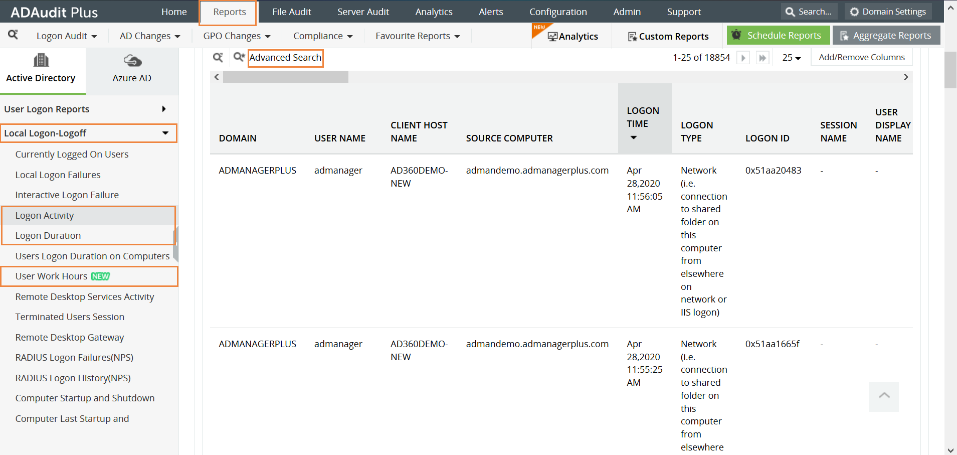 Klik op het tabblad 'Rapporten' en selecteer vervolgens 'Lokaal aanmelden-Afmelden'. Hier zijn er meerdere rapporten die u de aanmeldingsgegevens geven die u nodig hebt en meer. Aanmeldingsactiviteit toont de aanmeldingspogingen, met onder andere de gebruikersnaam, aanmeldtijd, naam van het werkstation en type aanmelding. Aanmeldingsduur toont u de aanmeldtijd, de afmeldtijd en de duur van elke aangemelde sessie. Werkuren van de gebruiker geeft de totale hoeveelheid tijd aan die de gebruiker aangemeld op het werkstation heeft doorgebracht.