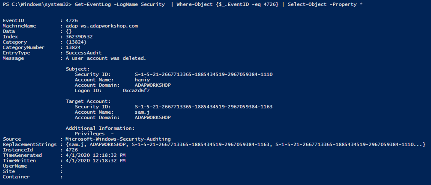 Get-EventLog -LogName Security | Where-object {$_. EventID -eq 4726} | Select-Object -Property *