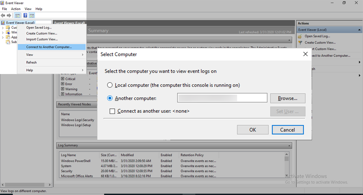Notitie: Als u een werkstation gebruikt, klikt u in de Logboeken met de rechtermuisknop op Logboeken (lokaal) in het linkerdeelvenster en klikt u op Verbinden met een andere computer... en voert u de naam van de DC in het volgende formaat in: