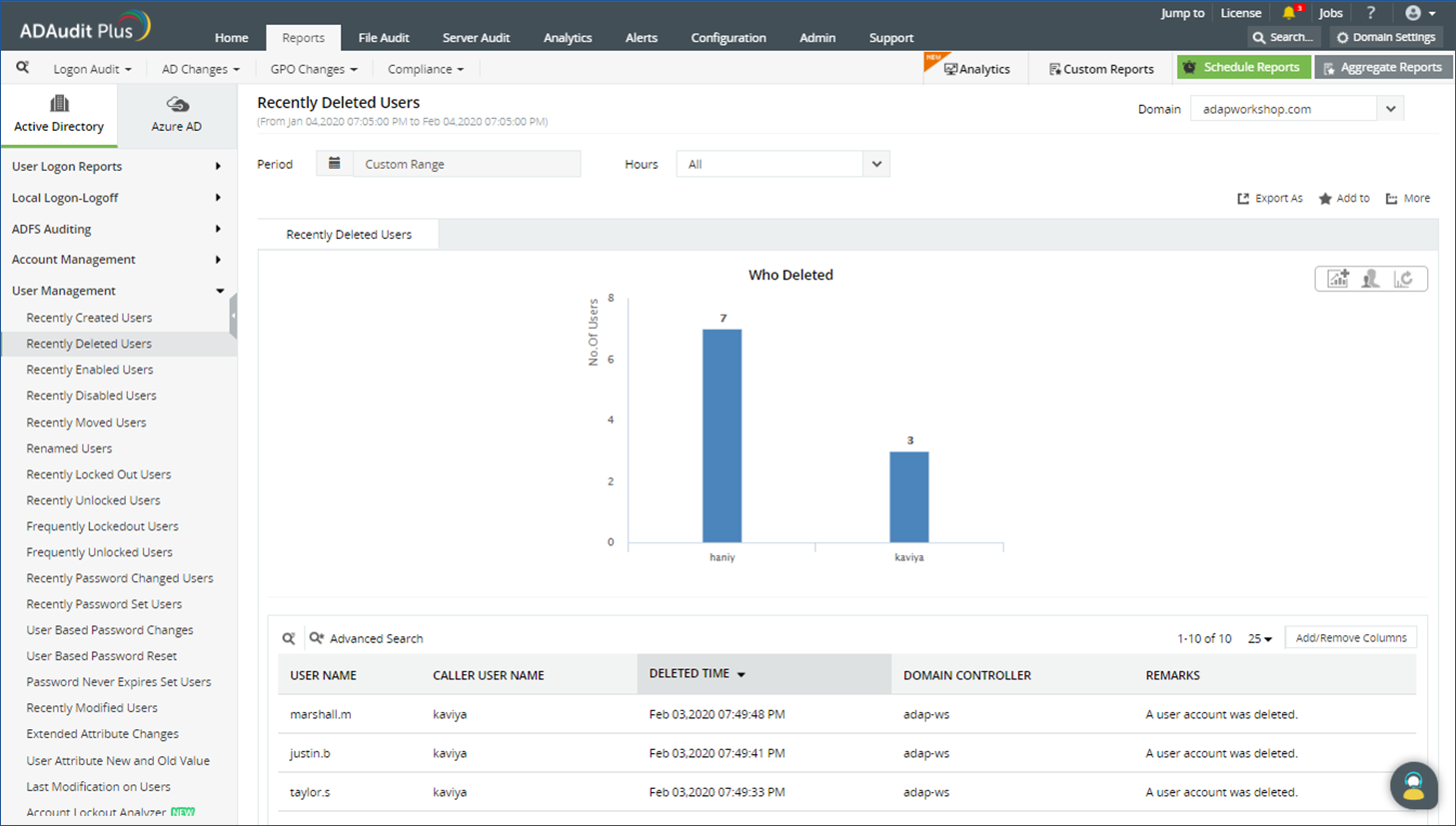 - Navigeer naar Rapporten > Active Directory > Gebruikersbeheer > Onlangs verwijderde gebruikers.