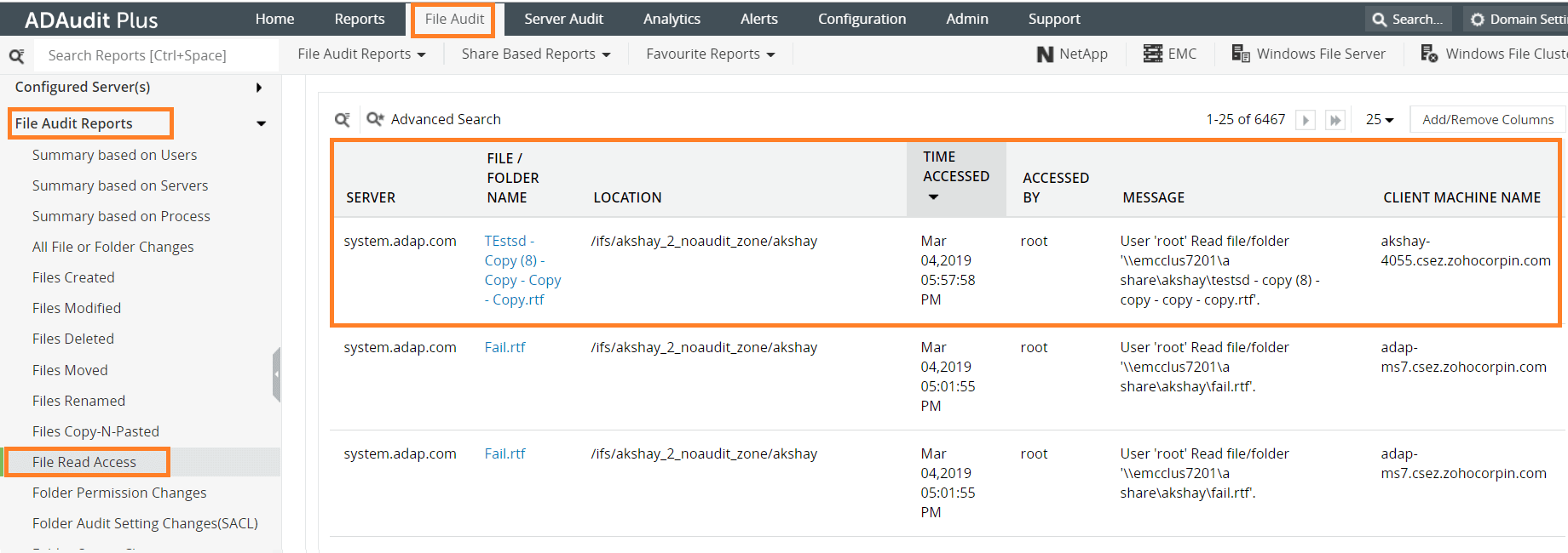 Meld aan bij ADAudit Plus en ga naar het tabblad Bestandscontrole. Navigeer onder Bestandscontrolerapporten naar het rapport Leestoegang bestand.