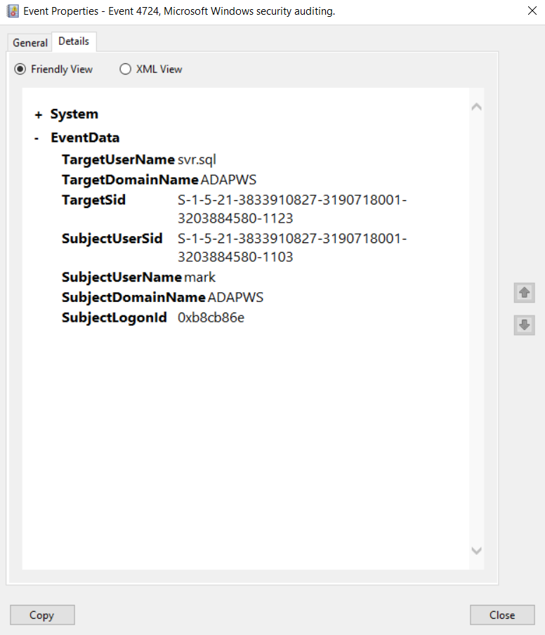 Gebeurtenis-ID 4724 wordt gegenereerd telkens wanneer een account probeert het wachtwoord voor een ander account te resetten (zowel gebruikers- als computeraccounts).