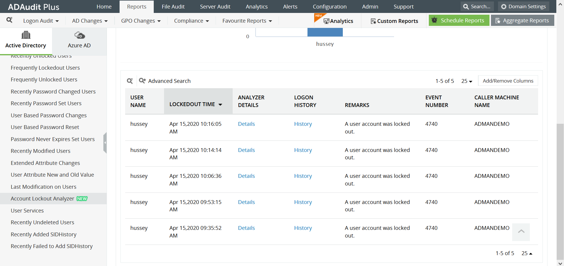 Zowel Windows PowerShell als ADAudit Plus kunnen u details over de accountvergrendeling bezorgen. PowerShell toont echter gewoon de informatie die u hebt gevraagd, terwijl ADAudit Plus, een krachtig audit- en rapportagehulpprogramma, informatie van verschillende bronnen in Active Directory kan analyseren en verwerken om uitgebreide en gebruikersvriendelijke rapporten op te maken.
