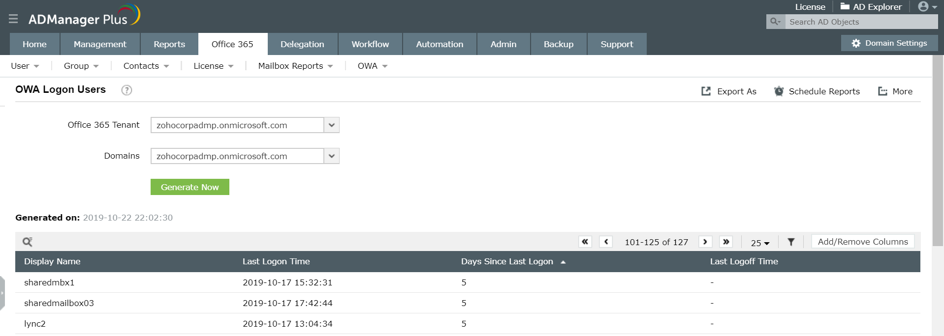 Met het laatste aanmeldingsrapport van ADManager Plus, kunnen beheerders de geschiedenis van de Office 365-gebruikersaanmelding verkrijgen voor alle Office 365-gebruikers tegelijk. Dit rapport: