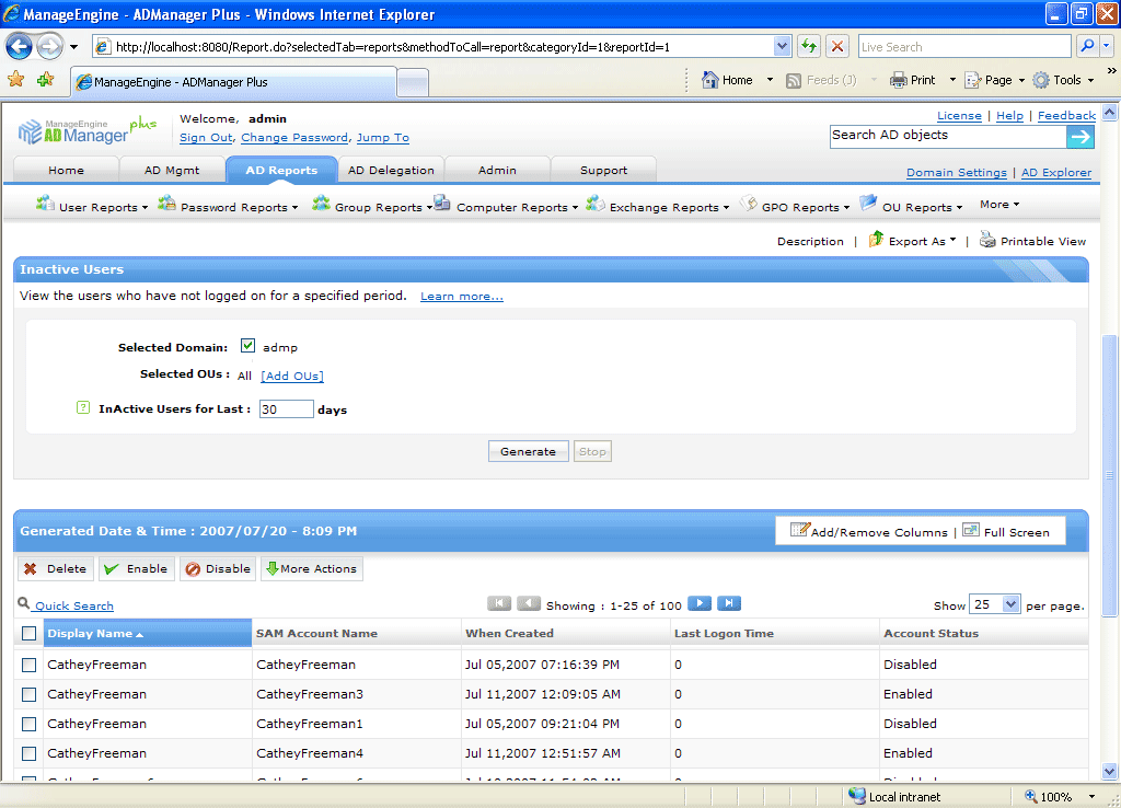 Beheerders kunnen inactieve gebruikers of computers, uitgeschakeld of verlopen accounts genereren en ze beheren vanuit de rapporten zelf door verplaatsen, uitschakelen, inschakelen of verwijderen van gebruiker- of computeraccounts naar een andere OU.