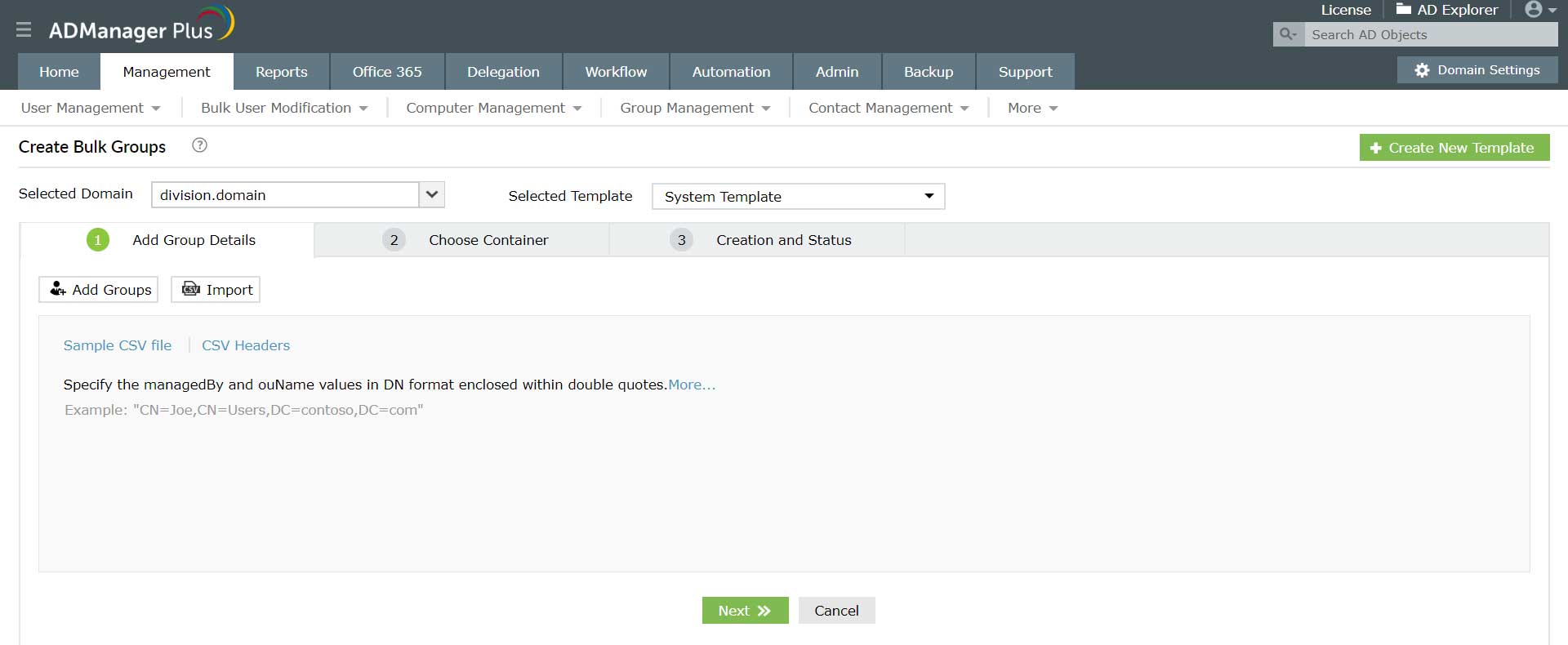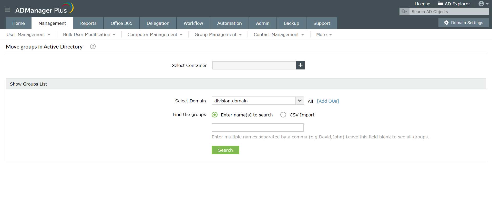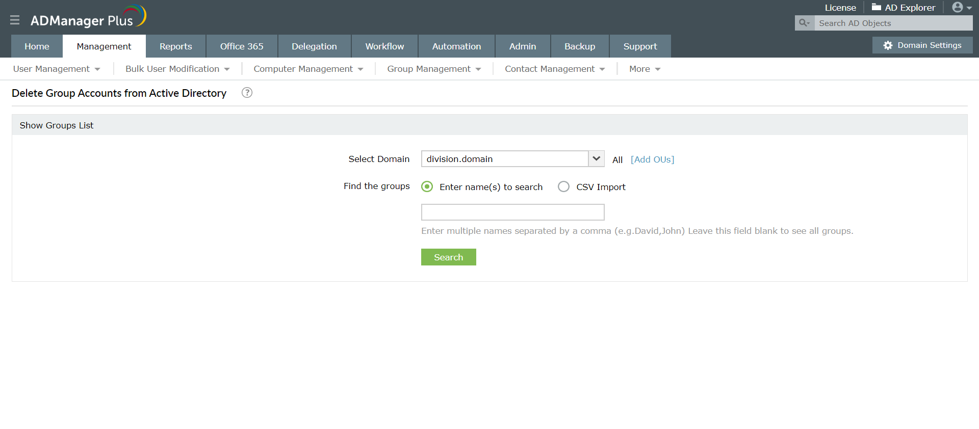 Met ADManager Plus kan de beheerder meerdere AD-groepen tegelijk verwijderen in plaats van ze één voor één te verwijderen met behulp van de systeemeigen tools van Active Directory.