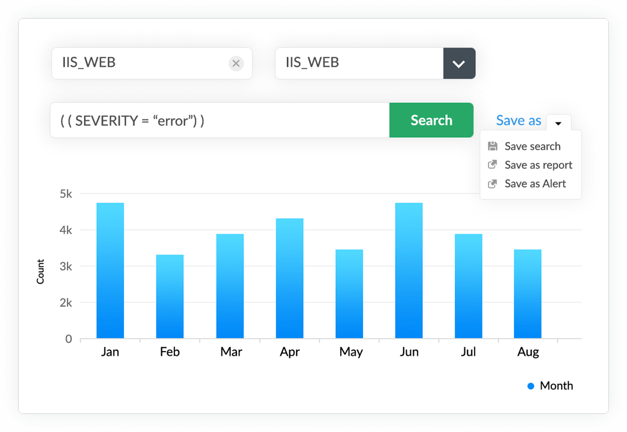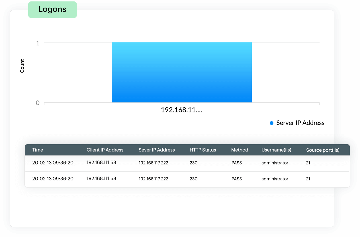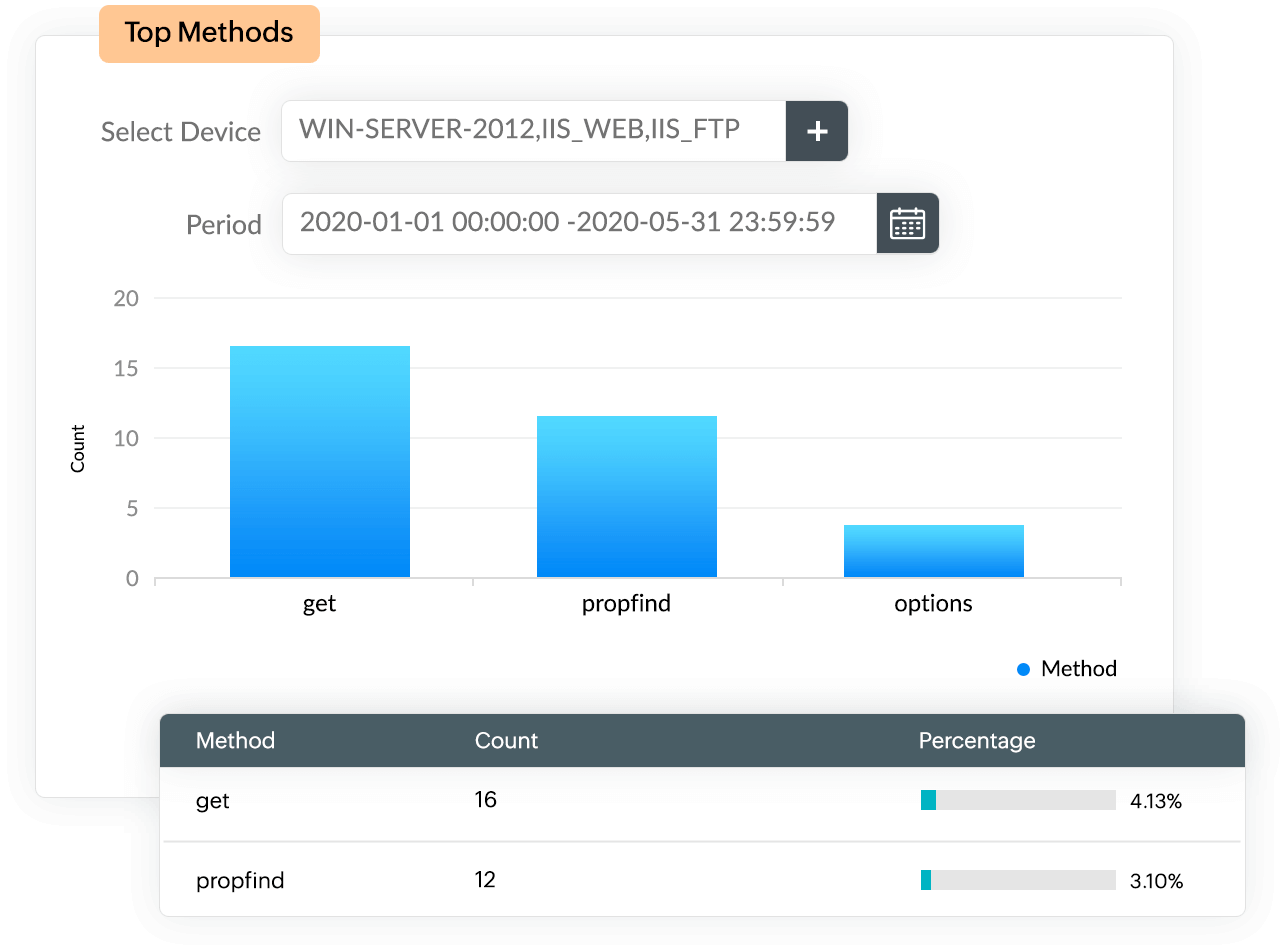 EventLog Analyzer supports over 750 log sources , including the W3C Extended format. The solution facilitates this by collecting, parsing, indexing, and analyzing logs from your IIS servers without any additional configuration. It also generates reports after parsing the IIS server logs to provide you with actionable insights. Collect and analyze universal logs of any type regardless of their source and format.