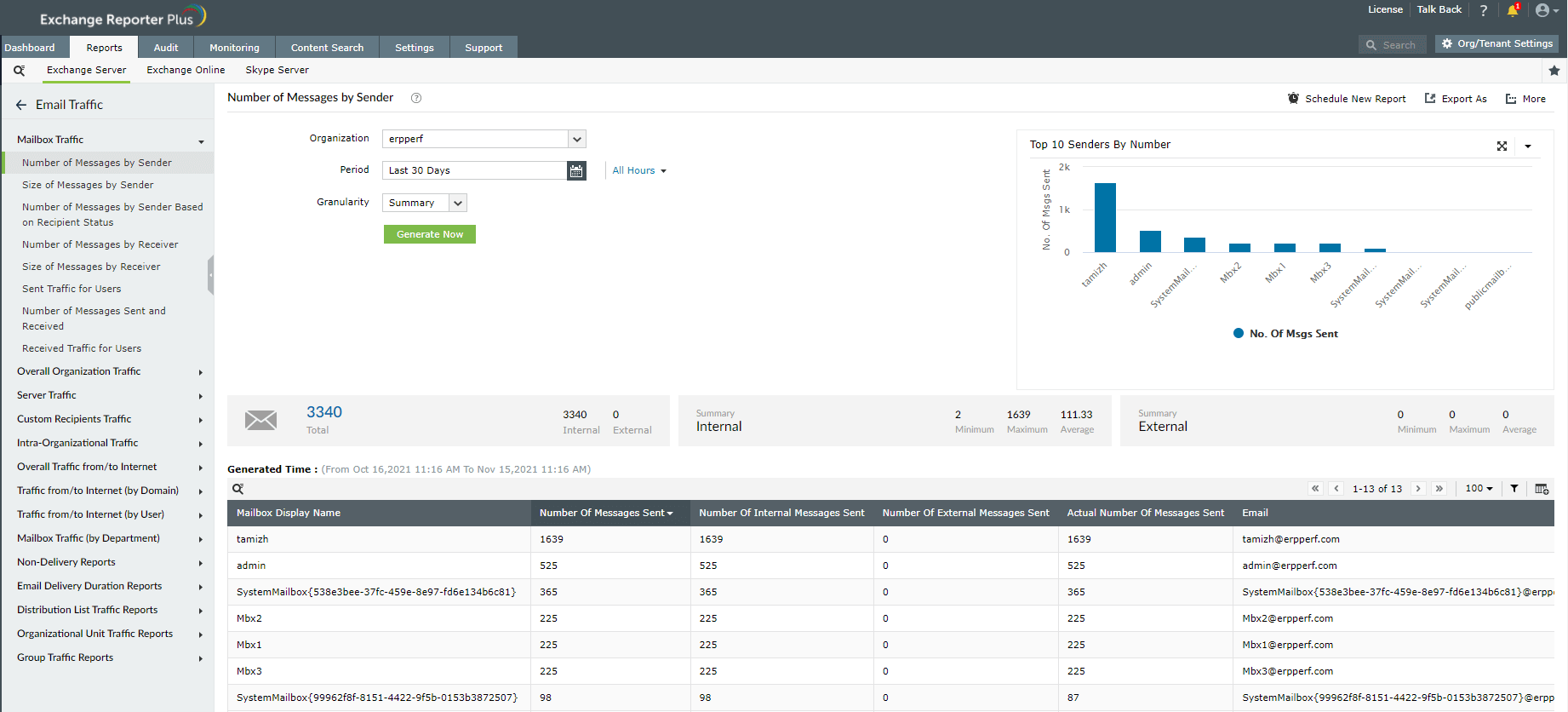 ManageEngine Exchange Reporter Plus is een oplossing voor rapportage, wijzigingscontrole, bewaking en hulpprogramma voor zoeken van inhoud voor Exchange Server, Exchange Online en Skype voor Bedrijven. Deze biedt meer dan 450 unieke rapporten over verschillende Exchange-entiteiten, zoals postvakken, e-mailverkeer, openbare mappen, Outlook Web Access en ActiveSync, samen met rapporten met gebruiks- en configuratiedetails over de server van Skype voor Bedrijven. Exchange Reporter controleert ook activiteiten in Exchange-servers en Exchange Online en kan e-mailwaarschuwingen in realtime verzenden.