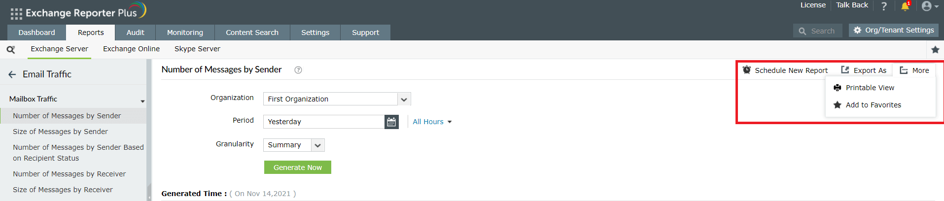 Met meer dan 450 vooraf gedefinieerde rapporten voor status-in-tijd, controle en bewaking, biedt Exchange Reporter Plus u complete zichtbaarheid in uw omgevingen Exchange on-premises, Exchange Online en Skype voor Bedrijven.