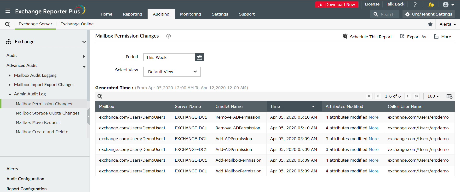 Het ophalen van auditlogboeken is een complexe taak. Als u specifieke behoeften hebt, kan het omleiden van de cmdlets met verschillende parameters om uw zoekactie aan te passen, meer problemen creëren en zult u nog steeds niet het gewenste resultaat verkrijgen. Exchange Reporter Plus, een Exchange-hulpprogramma voor rapportage, wijzigingscontroles en bewaking, biedt verschillende rapporten over beheerdersactiviteiten voor zowel Exchange Server- als Exchange Online-platforms. Daarnaast geeft het hulpprogramma u een optie voor het toevoegen van nieuwe parameters aan de cmdlet en het controleren van alle vereiste wijzigingen.
