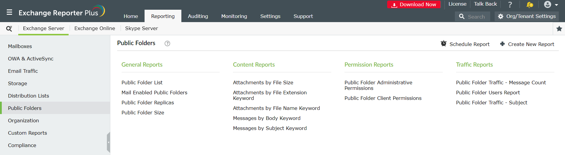 Exchange Reporter Plus biedt granulaire inzichten over de statistieken van verschillende openbare mappen. U kunt de rapporten plannen om regelmatige updates te krijgen en, nog belangrijker, tijd te sparen die u onnodig besteedt aan het schrijven van vervelende PowerShell-scripts. Zoek hieronder de volledige lijst van rapporten over statistieken van openbare mappen, aangeboden door Exchange Reporter Plus.