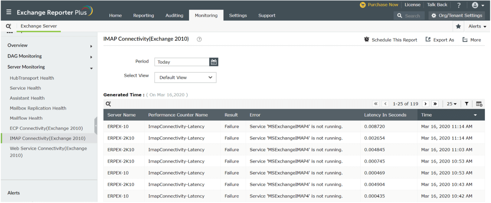 Deze cmdlet is eenvoudig en werkt goed met Exchange 2010. Maar in latere versies van Exchange moet u de cmdlet Invoke-MonitoringProbe gebruiken om de correcte resultaten te verkrijgen. Exchange Reporter Plus, een Exchange-hulpprogramma voor rapportage, wijzigingscontrole en bewaking, helpt u bij de 24/7 bewaking van de IMAP en geeft waarschuwingen weer voor belangrijke problemen.