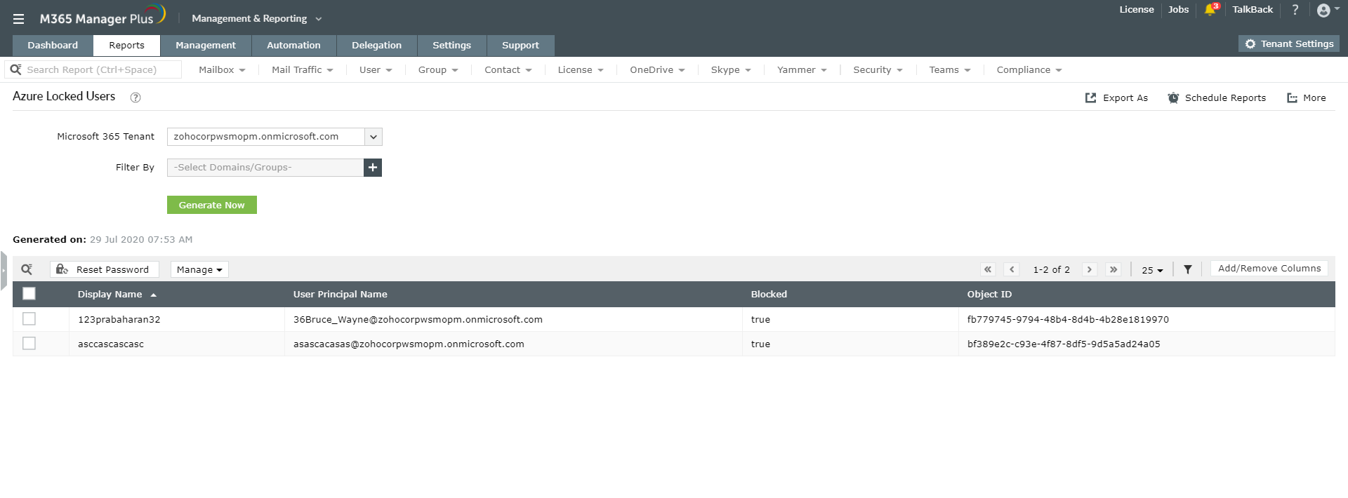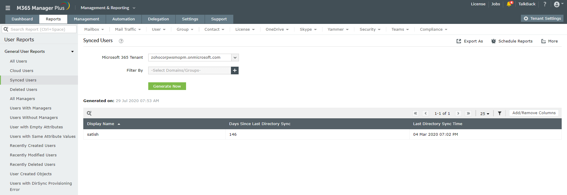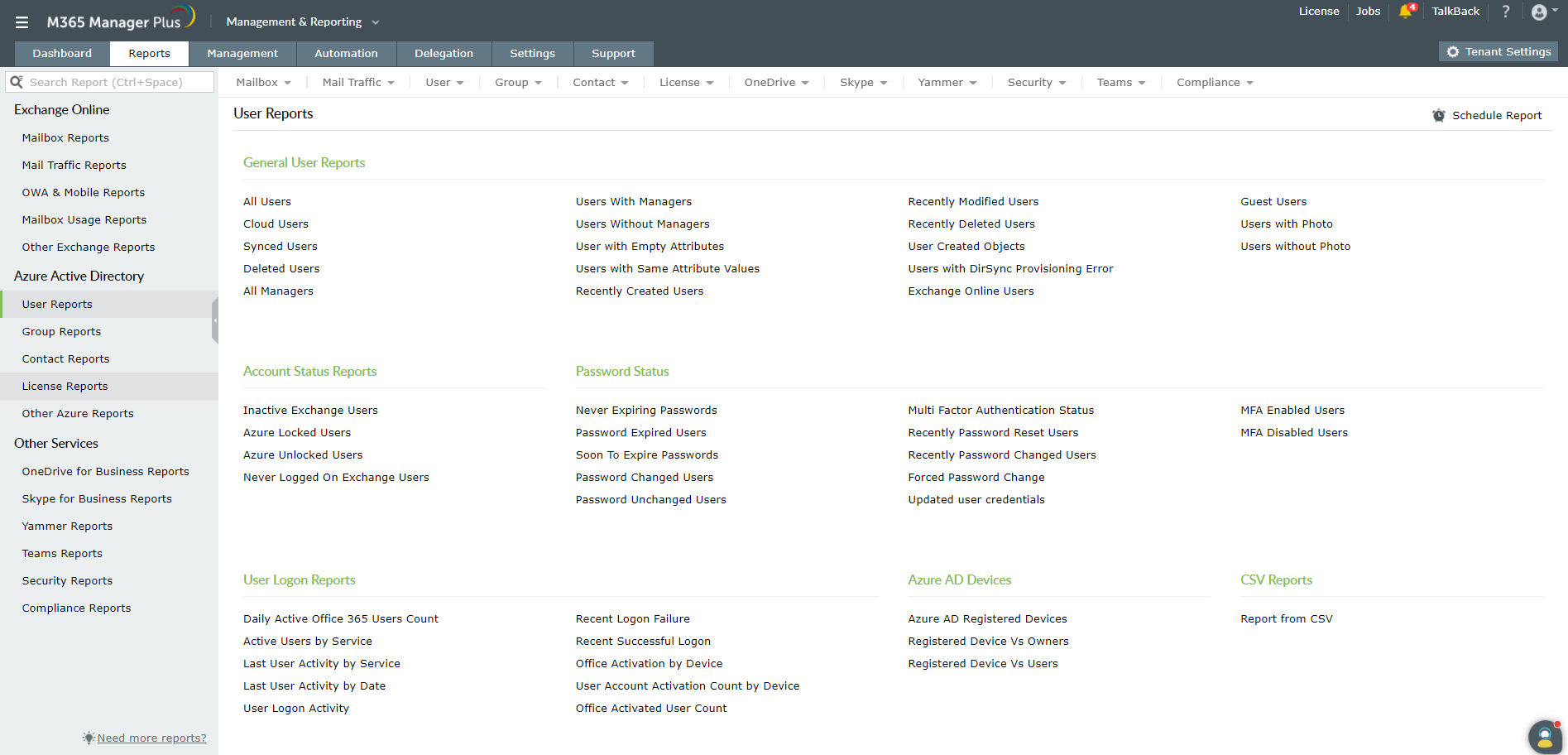 M365 Manager Plus, het Microsoft 365-hulpprogramma voor rapportage, controle, waarschuwen, monitoring en beheer, elimineert de behoefte om PowerShell-scripts te maken. Het biedt meer dan 700 vooraf geconfigureerde rapporten over Azure Active Directory (Azure AD), Exchange Online, Skype voor Bedrijven, Yammer, Microsoft Teams en andere Microsoft 365-services. U krijgt een uitgebreide lijst van rapporten over Microsoft 365-users, zoals de gesynchroniseerde gebruikersrapporten, verwijderde gebruikersrapporten, gebruikers met beheerders, gebruikers met of zonder foto's enz.