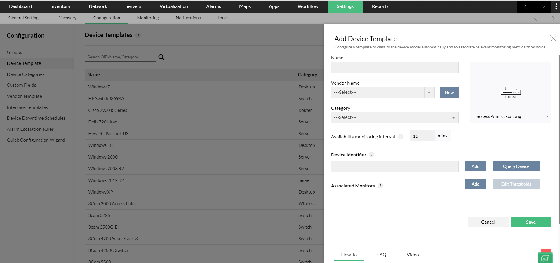 Apparaatsjablonen: Rangschik uw apparaatmodellen automatisch en nauwkeurig met behulp van een verzameling vooraf geconfigureerde sjablonen. Die apparaatsjablonen zijn voorzien van vooraf gedefinieerde monitors en variabele drempelwaarden om waarschuwingen te genereren wanneer SLA's worden geschonden.