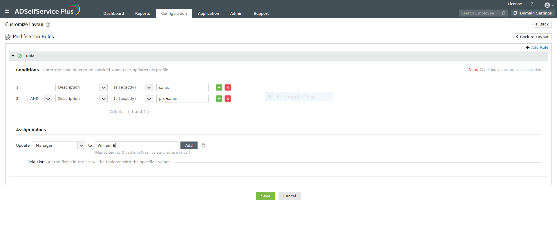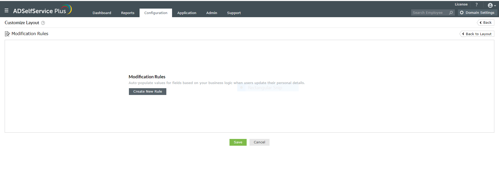 Met ADSelfService Plus kunnen beheerders nu wijzigingsregels instellen voor afzonderlijke layouts, die waarden voor kenmerken automatisch invullen op basis van uw organisatiebeleid. Wijzigingen die door de gebruikers worden aangebracht in hun mijn info worden gecontroleerd met de voorwaarden van de geconfigureerde wijzigingsregels. Als de wijzigingen aan de opgegeven voorwaarden voldoen, worden de waarden die door de beheerder aan specifieke attributen zijn toegekend, ook gewijzigd. Maak regels op basis van uw vereisten en organisatiebeleid om alle vereiste velden automatisch bij te werken.