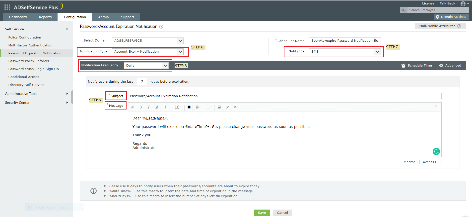 Het PowerShell-script voor de melding voor verlopen accounts dat hier is opgegeven, verzendt e-mailherinneringen naar Active Directory-gebruikers over hun accounts die zullen verlopen. ADSelfService Plus, een Active Directory selfservice-oplossing voor wachtwoordbeheer en eenmalige aanmelding, ondersteunt ook het verzenden van meldingen voor het verlopen van accounts naar AD-gebruikers. Hier vindt u een vergelijking van de melding voor het vervallen van een AD-account met PowerShell en met ADSelfService Plus.