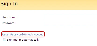 Door ADSelfService Plus te integreren met SharePoint wordt ook een koppeling Wachtwoord resetten/Account ontgrendelen op de inlogpagina van SharePoint geplaatst om gebruikers te helpen hun vergeten wachtwoorden te resetten of hun accounts te ontgrendelen.