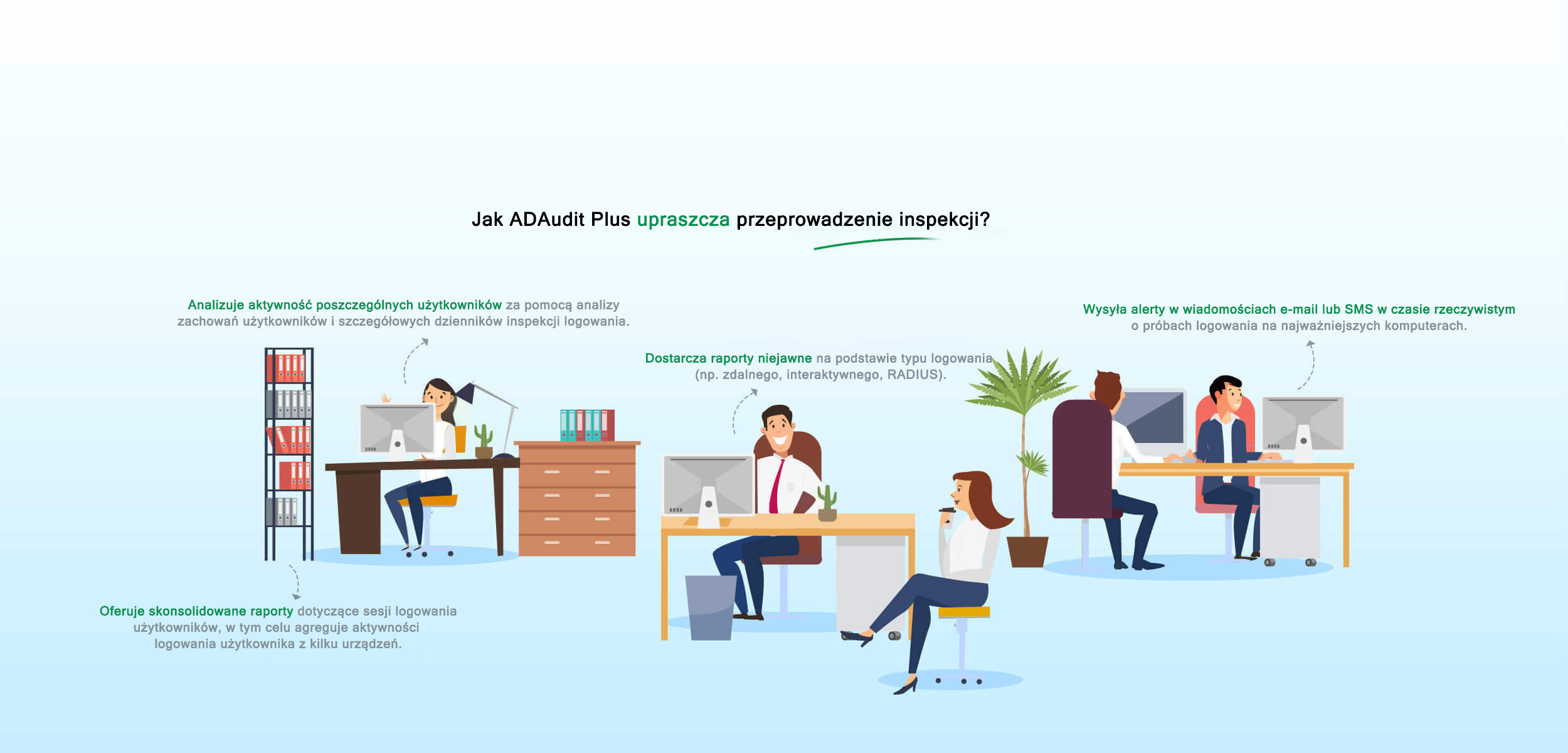 Monitorowanie w czasie rzeczywistym i informacje przedstawione w graficznej formie pozwalają lepiej zapoznać się z zachowaniami użytkowników i wzorcami logowania.