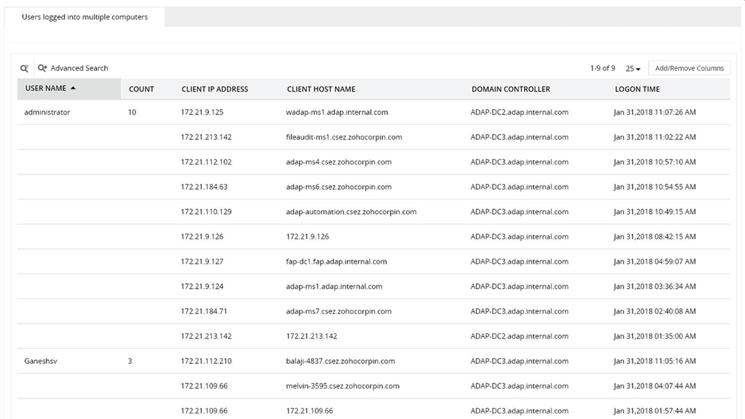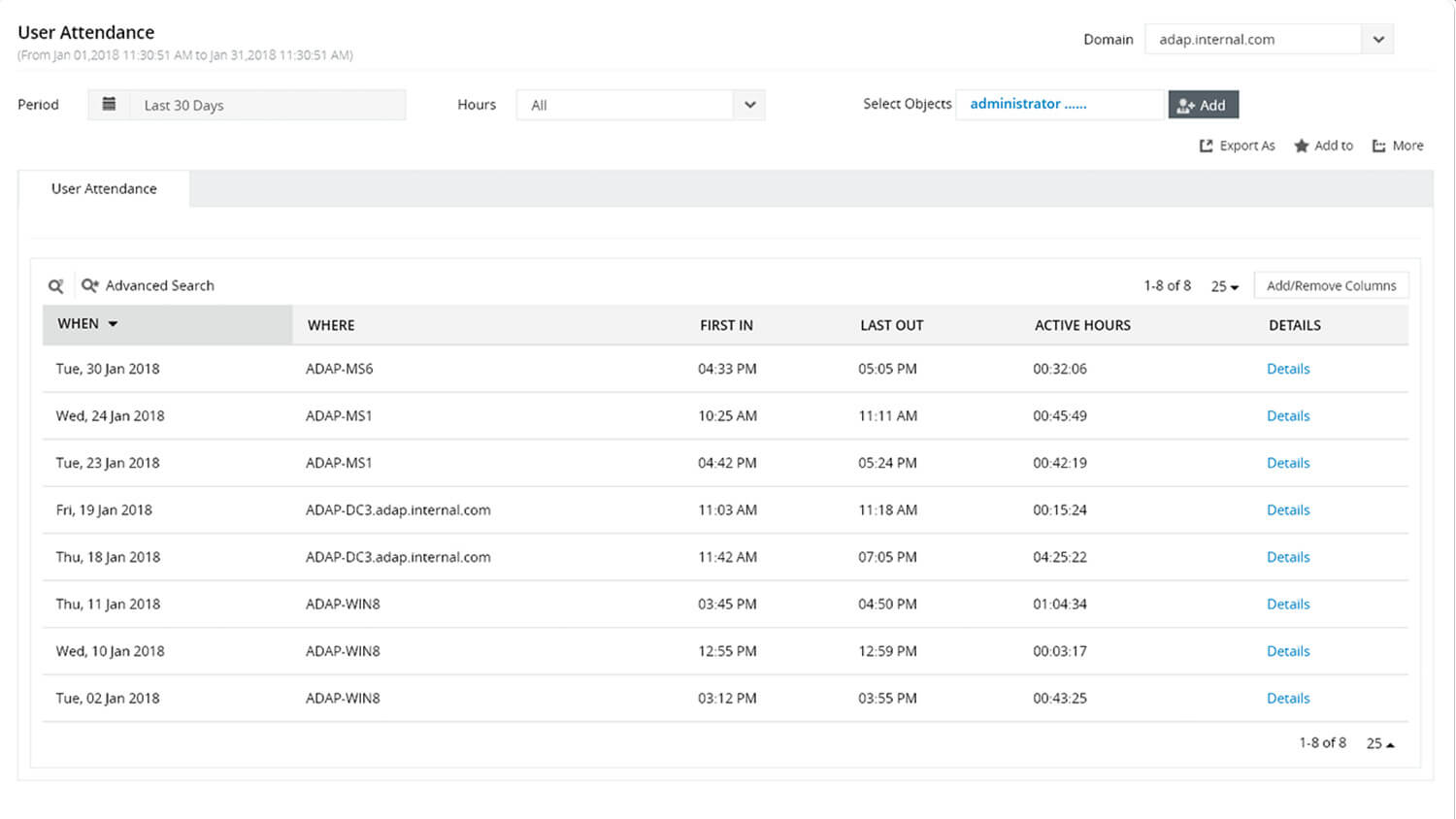 ADAudit Plus pobiera obszerną historię logowania użytkowników, pozwala zapoznać się z zachowaniem użytkowników i pomaga wykryć potencjalne zagrożenia ze strony informatorów.