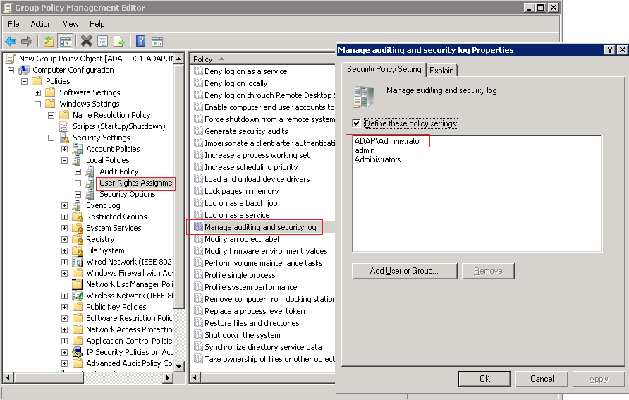 Dodaj użytkownika do zasad „Zarządzaj dziennikami inspekcji i zabezpieczeń”; ustawienie to można znaleźć w Konfiguracja komputera | Ustawienia systemu Windows | Ustawienia zabezpieczeń | Zasady lokalne | Przypisywanie praw użytkownika. Użyj nowo utworzonego GPO i przesuń to ustawienie do wszystkich serwerów poddawanych inspekcji.