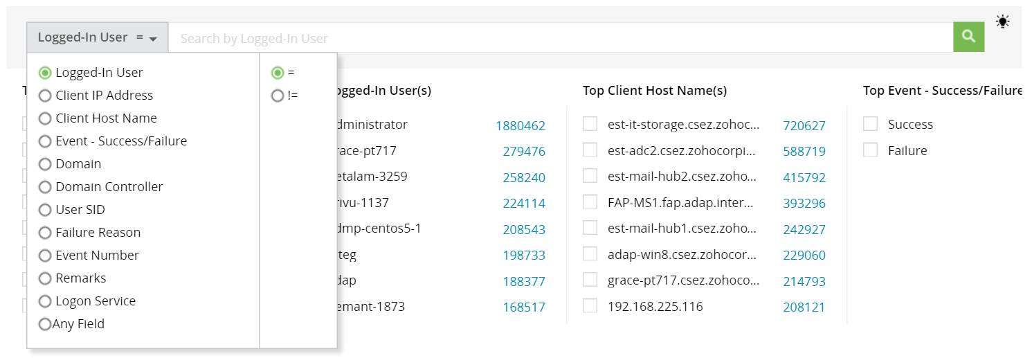 Ten link pozwala na wyszukiwanie zapytania we wszystkich kategoriach logów. Gdy zapytanie jest wyszukiwane, najpierw zostanie wyświetlone podsumowanie wyników zapytania dla wszystkich kategorii logów, a następnie będzie można je dokładniej przeanalizować, aby zobaczyć rzeczywisty raport.