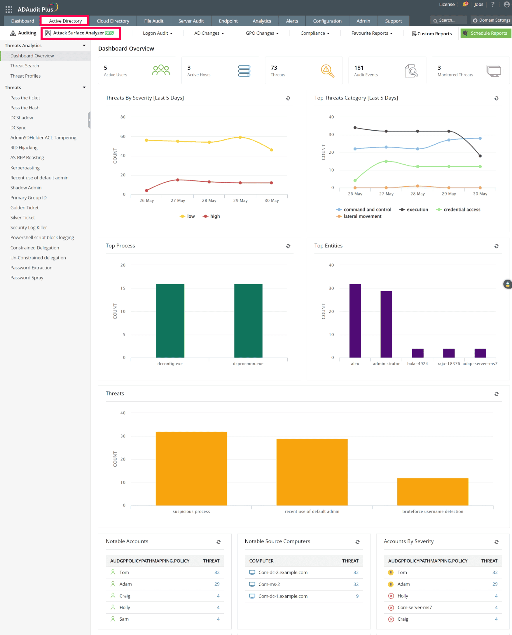 Analityk Powierzchni Ataku dla AD jest wyposażony w ponad 25 ekskluzywnych raportów, które pomagają w wykrywaniu różnych ataków na AD. Wszystkie domeny AD skonfigurowane do audytu w ADAudit Plus są automatycznie dodawane do analizy powierzchni ataku.