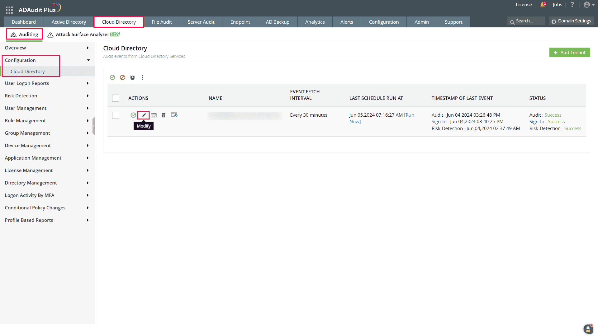 - Kliknij opcję Modify dla katalogu chmurowego, który chcesz skonfigurować do analizy powierzchni ataku.