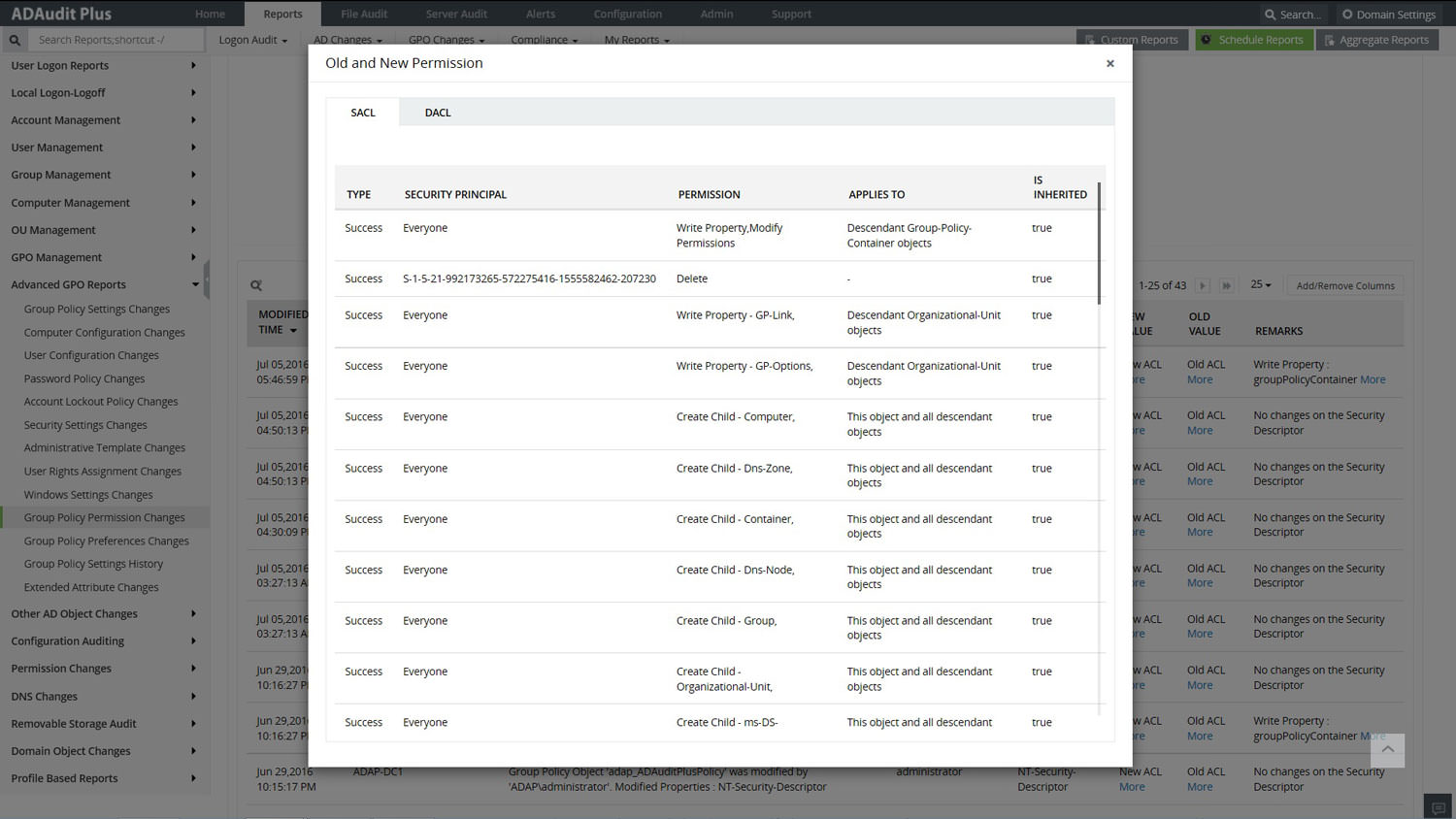 Wybierz widok dla pojedynczej lub wielu zmian zasad grupy, każda zmiana listy kontroli dostępu (ACL) wraz ze starymi i nowymi wartościami w czasie rzeczywistym. To ułatwia śledzenie zmian i pomaga odwrócić ich efekt.