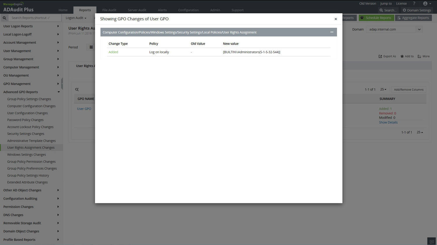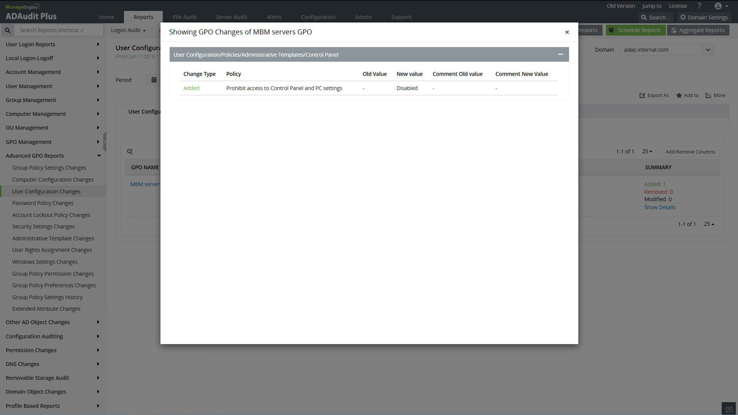 Zawierające wszystko raporty koncentrują się dokładnym wglądzie ze szczegółowym podsumowaniem nowych i starych wartości zmian GPO.