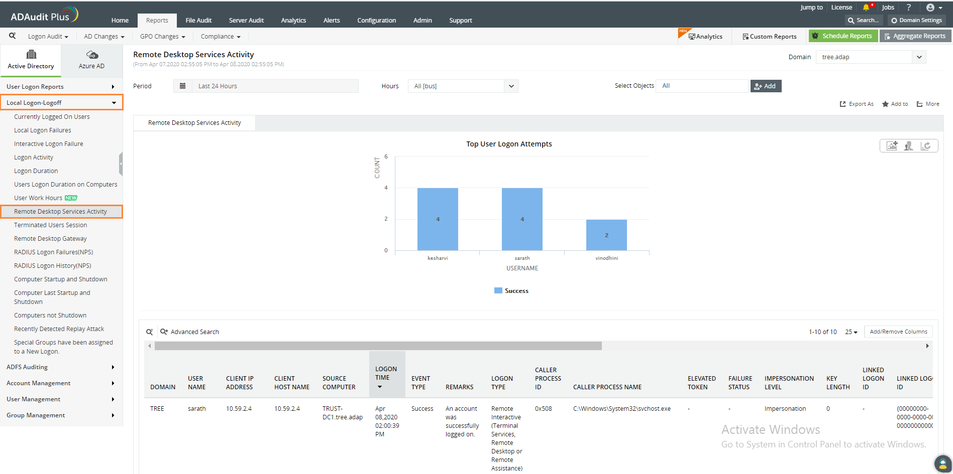 ADAudit Plus automatycznie skanuje wszystkie kontrolery domeny dostępne w domenie, aby pobrać informacje o użytkownikach aktualnie zalogowanych zdalnie w komputerze, wygenerować raport oraz zaprezentować go na prostym i intuicyjnym interfejsie użytkownika.