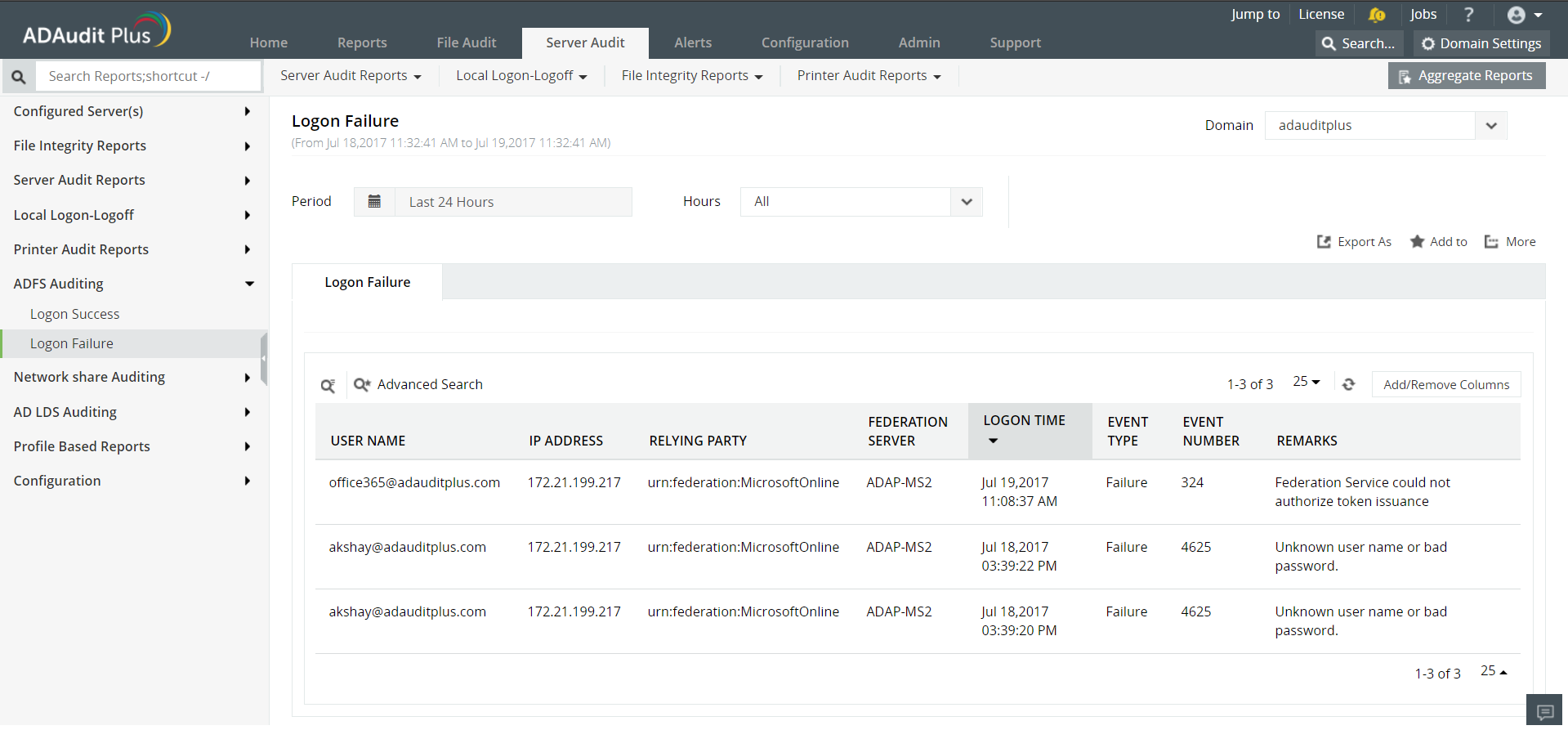 ADAudit Plus to narzędzie do inspekcji i raportowania usługi Active Directory, które czuwa nad wszystkimi zdarzeniami w sieci. Zawiera wyłączny zestaw raportów ADFS, który stanowi zaledwie część z ponad 200 wstępnie spakowanych raportów dostępnych w konsoli.