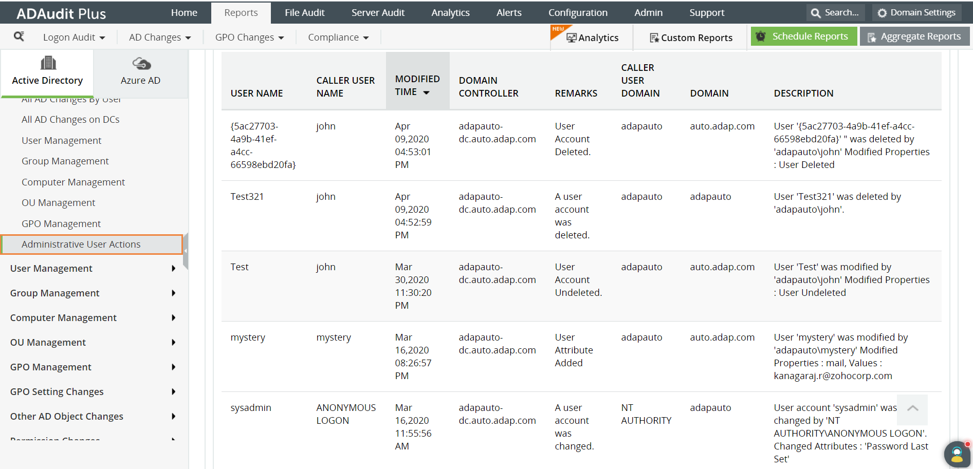 - Przejdź do obszaru Raporty -> Zarządzanie kontem -> Działania użytkownika administracyjnego.
