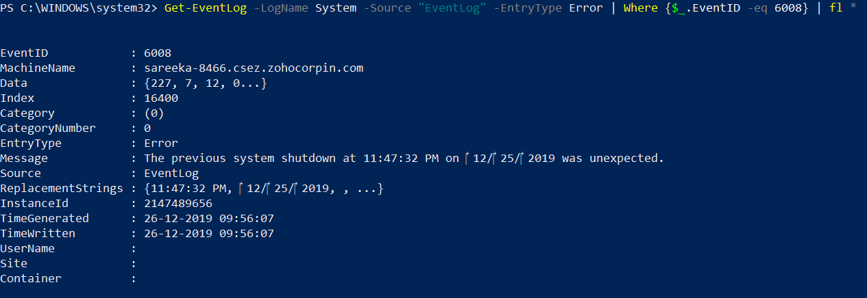 "EventLog" -EntryType Error | Where {$_.EventID -eq 6008} | fl * | Out-File -Filepath