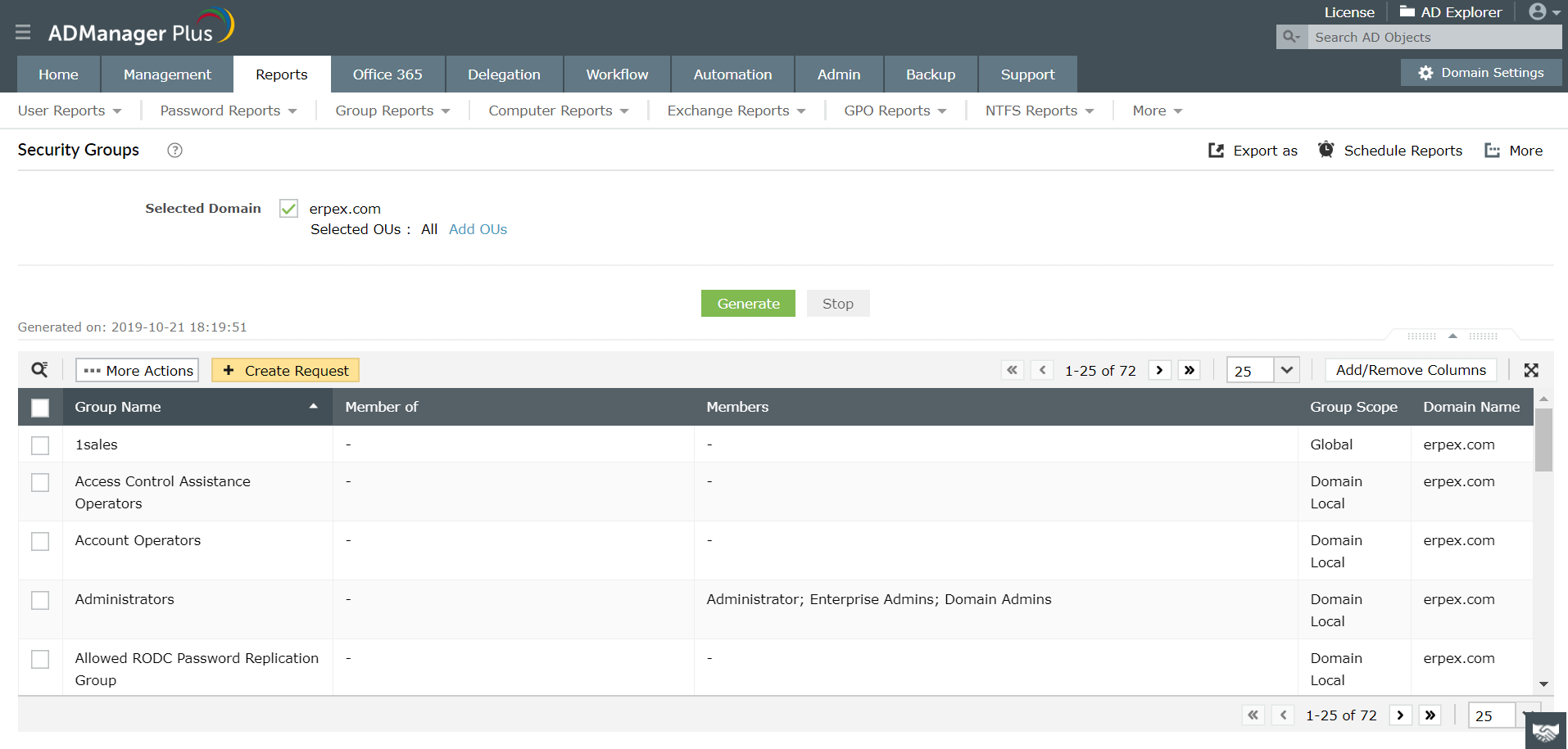 Oprócz gotowych raportów grup, to narzędzie zapewnia również raporty użytkowników, raporty komputerów, raporty obiektów zasad grupy (GPO) itp. dla uproszczonego i szybkiego raportowania Active Directory. Ponadto, dzięki raportom specyficznym dla serwera Exchange, to narzędzie pomaga również w raportowaniu Exchange.