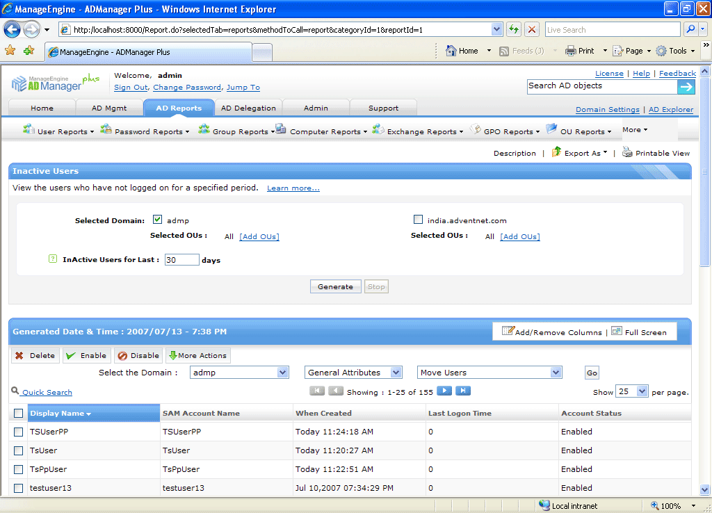- Przeniesienie użytkowników z żądanych raportów usługi AD z programu ADManager Plus, tj. wygenerowanie raportów Nieaktywny użytkownik lub Wyłączeni użytkownicy i przeniesienie ich do odpowiedniego kontenera.