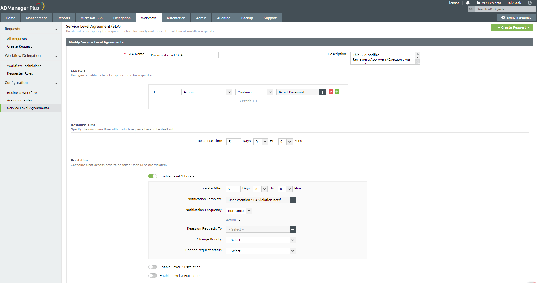 W tym miejscu do gry wchodzą umowy o poziomie usług (SLA) ADManager Plus w ramach przepływów pracy AD.