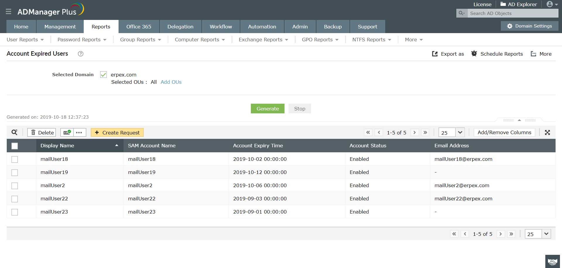 Konta użytkowników usługi Active Directory, które przez długi czas były przestarzałe, mogły wygasnąć bez wiedzy użytkownika lub administratora. Napisanie skryptu w celu znalezienia wygasłych kont może być uciążliwe — generator raportów ADManager Plus skanuje usługę Active Directory i podaje listę wszystkich wygasłych kont. Bezpośrednio na podstawie raportu administratorzy mogą aktywnie zabezpieczać swoją sieć, usuwając użytkowników, wyłączając ich albo przenosząc starych użytkowników do innej jednostki organizacyjnej. Możesz ponadto eksportować wygasłe konta oraz inne ważne raporty, na przykład o zablokowanych użytkownikach, do pliku w formacie XLS, CSV, PDF, HTML itp.