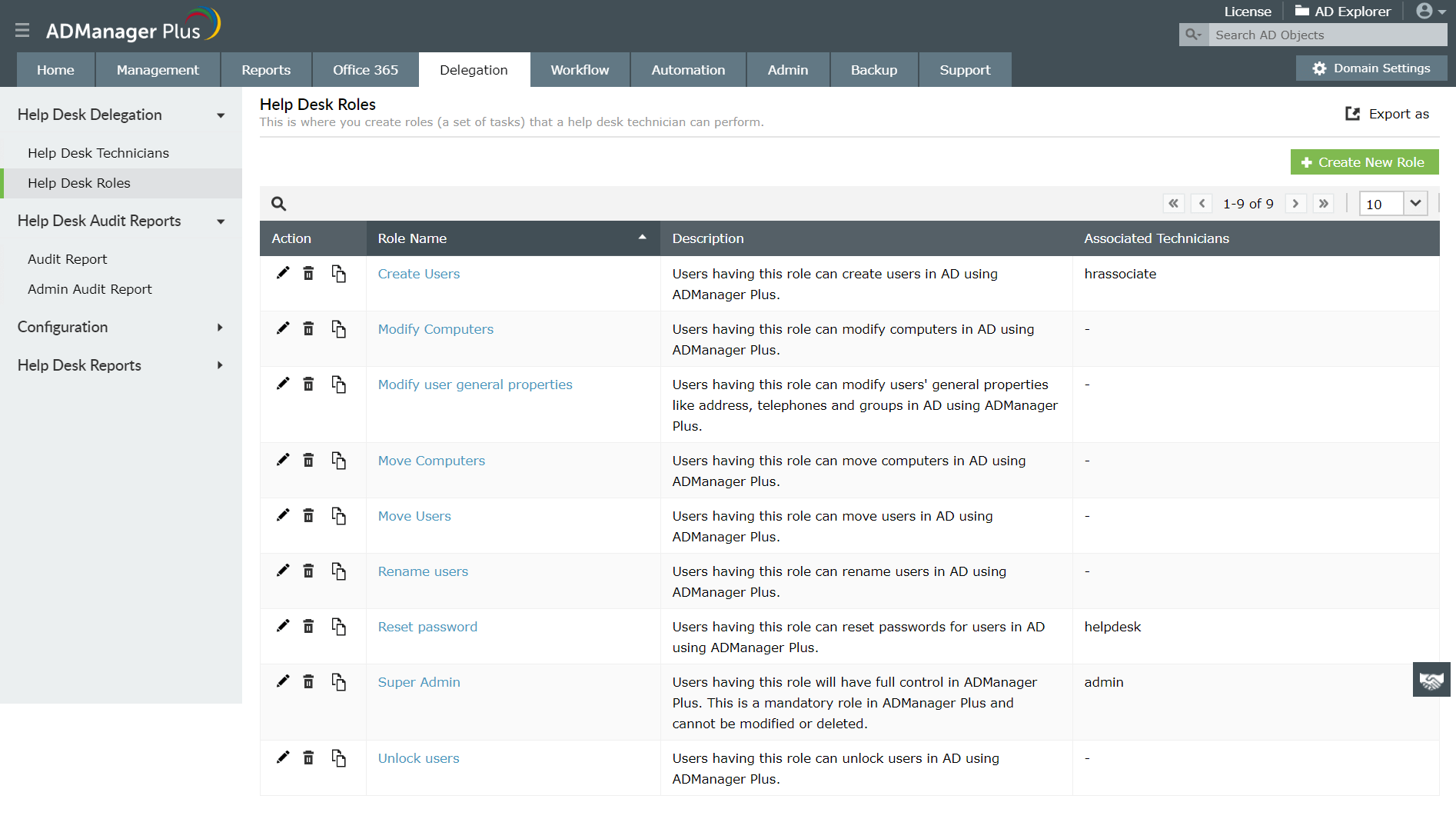 Na szczęście ADManager Plus, oparte na sieci Web oprogramowanie do zarządzania i raportowania Active Directory, zapewnia bardzo potrzebną możliwość delegowania rutynowych zadań związanych z zarządzaniem i obsługą Active Directory, Exchange, Office 365 i G Suite w całym przedsiębiorstwie za pomocą potężnego „Help Desk Active Directory” Funkcja delegowania. Umożliwia administratorowi AD delegowanie zadań do użytkowników nieadministracyjnych, takich jak technicy pomocy technicznej, z odpowiednimi kontrolami uwierzytelniania i autoryzacji, które znacznie zmniejszają obciążenie pracą administratora AD.