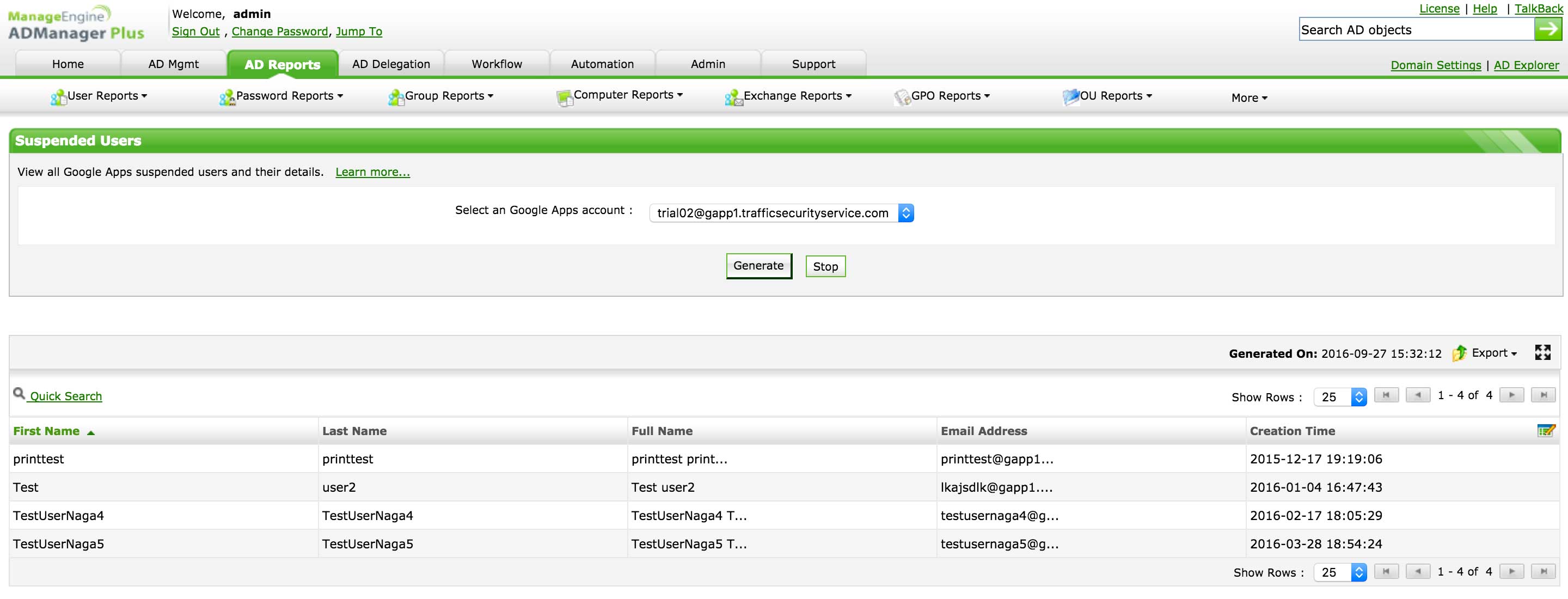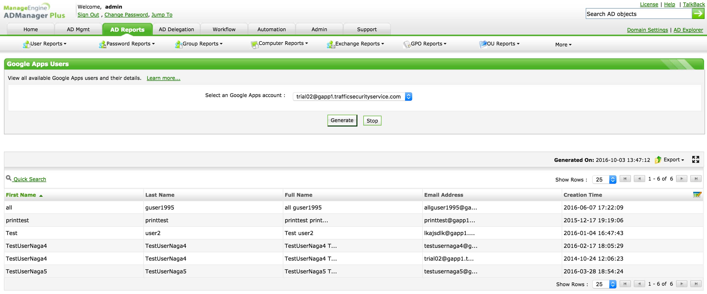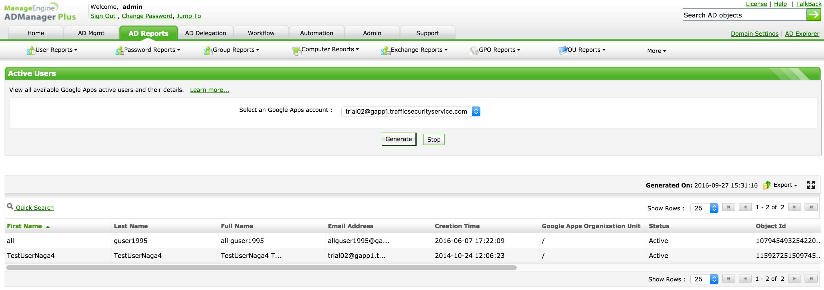 Wyświetlaj wszystkich użytkowników w środowisku Google Workspace wraz z ważnymi szczegółami, takimi jak ich jednostki organizacyjne Google Workspace, adresy e-mail, identyfikatory obiektów, działy, stanowiska, czas ostatniego logowania, czas utworzenia itp.