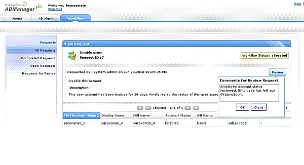Recenzent loguje się do ADManager Plus - -> Kliknij zakładkę przepływu pracy