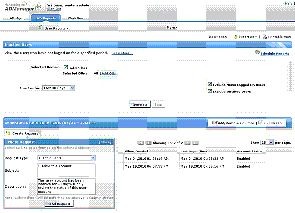 Wnioskodawca loguje się do ADManager Plus - -> Generuje raport nieaktywnych użytkowników