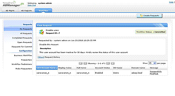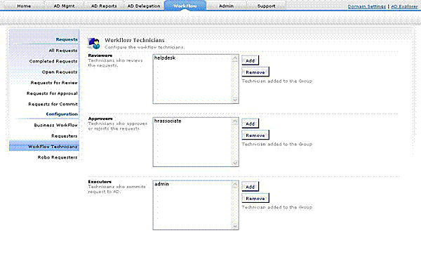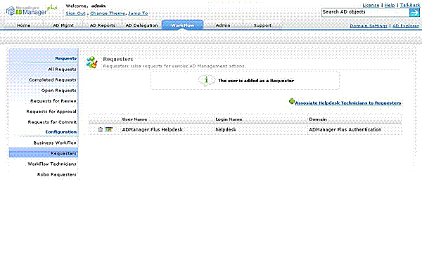 Pomoc techniczna loguje się do ADManager Plus - -> Kliknij zakładkę przepływu pracy