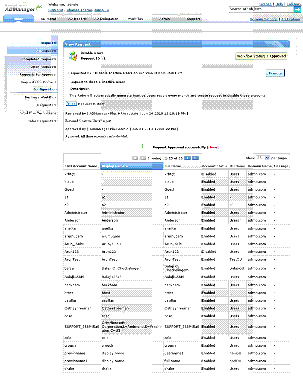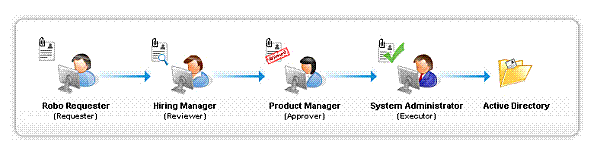 1) Robo (Wnioskodawca) generuje raport nieaktywnych użytkowników i tworzy wnioski o ich dezaktywację