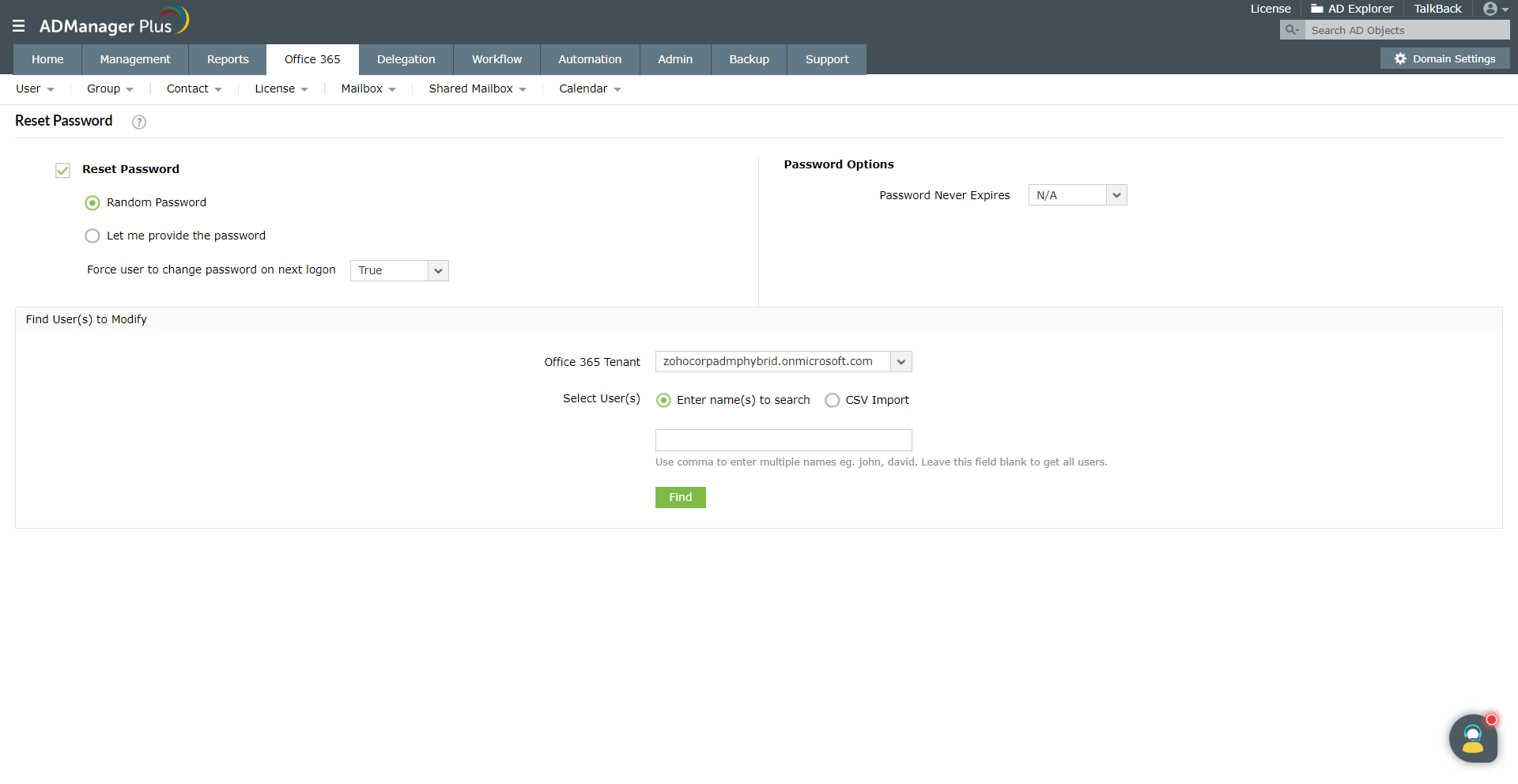 Program ADManager Plus pozwala na łatwe resetowanie haseł kont użytkowników usługi Office 365 z poziomu jednej konsoli i bez konieczności przełączania wielu okien. Można również ustawić właściwości hasła, takie jak Wymuszaj zmianę hasła przy następnym logowaniu lub Hasło nigdy nie wygasa dla kont użytkowników usługi Office 365.