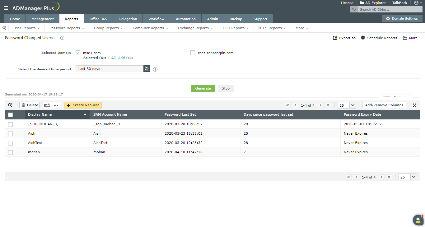 ADManager Plus pozwala na uzyskanie raportu o dacie ostatniej zmiany hasła użytkowników usługi AD w formacie CSV, PDF, HTML lub XLSX za pomocą prostego i intuicyjnie zaprojektowanego interfejsu użytkownika.